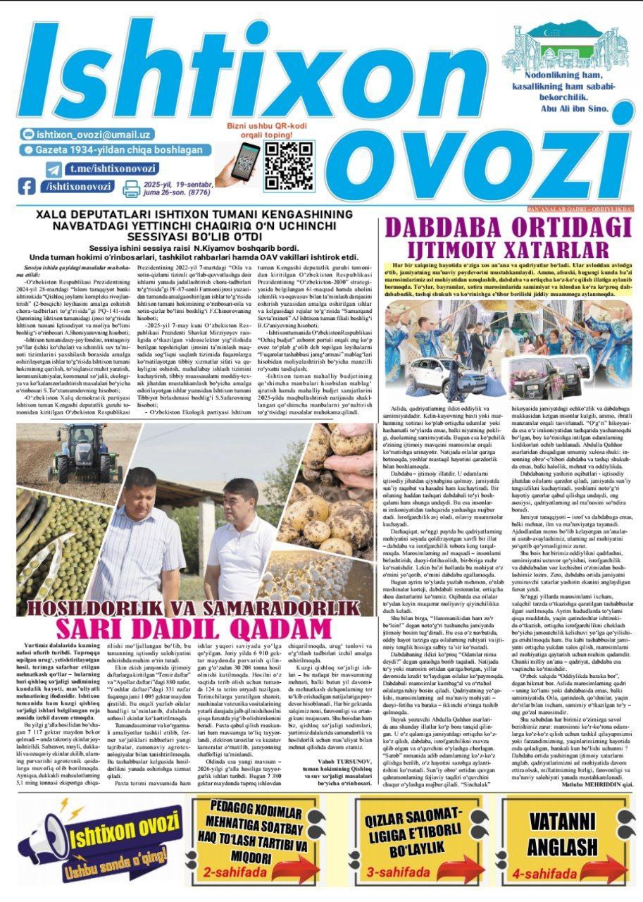 "ISHTIXON OVOZI" gazetasining 2025-yil, 19-sentabr kungi 26-soni mutolaa uchun hav…